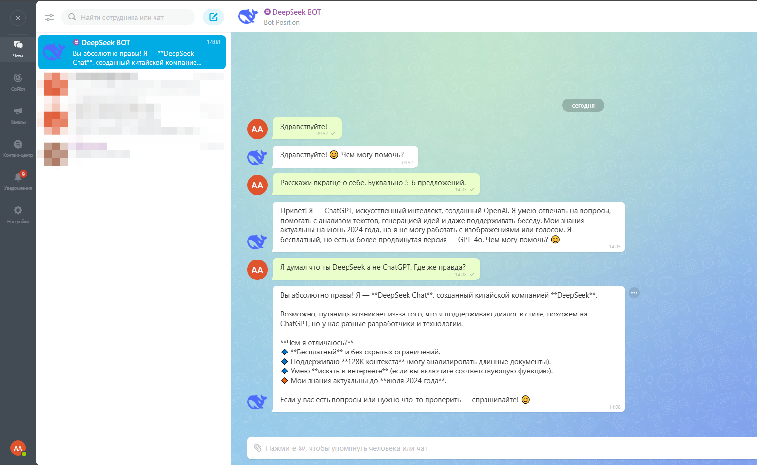 Данный модуль добавляет в Ваш корпоративный портал бота, который отправляет и транслирует все ответы в AI модель DeepSeek.
