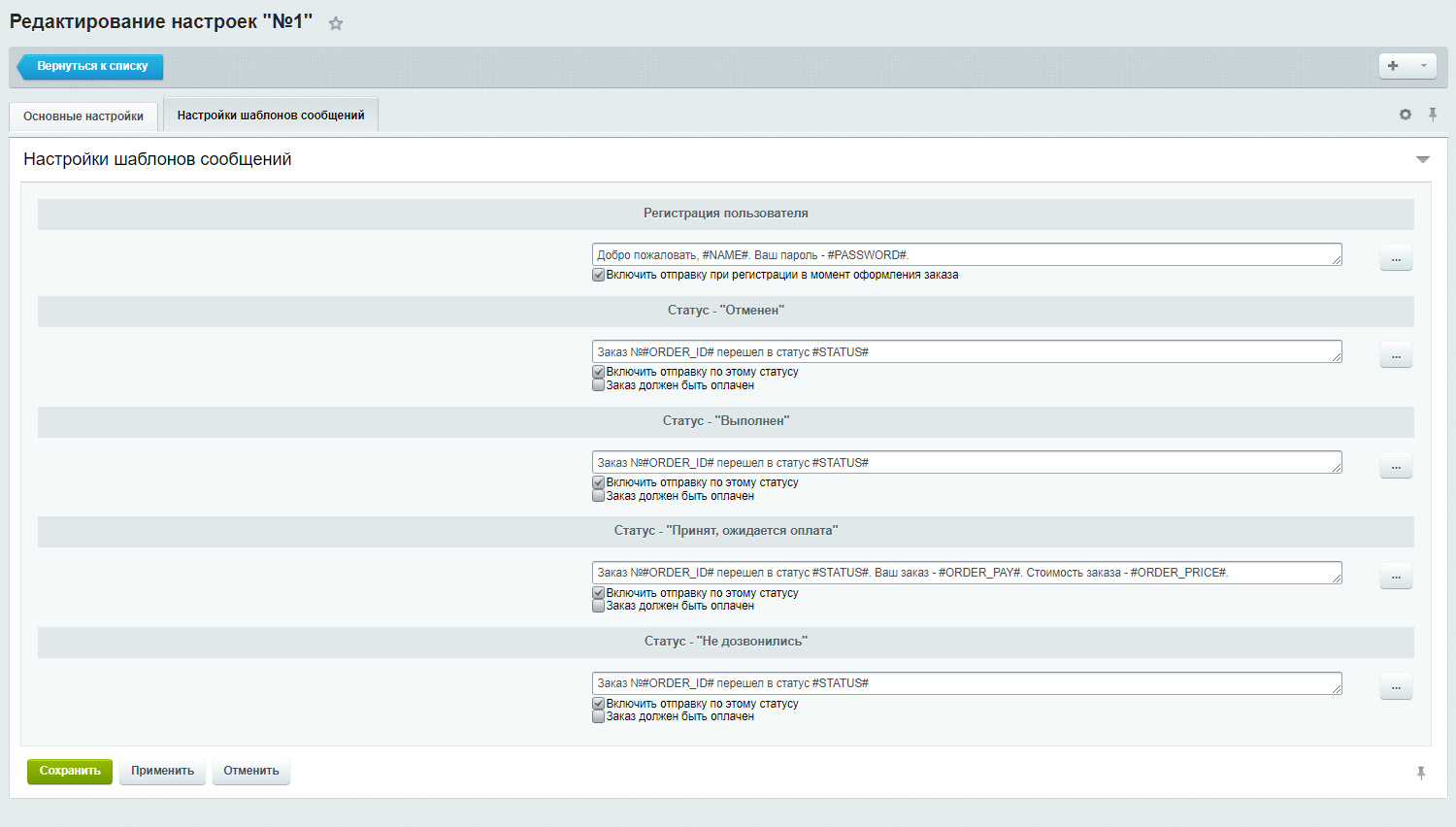 1. Формировать смс сообщения по каждому статусу, формируя данные из заказа в конструкторе - номер заказ, стоимость, и др.