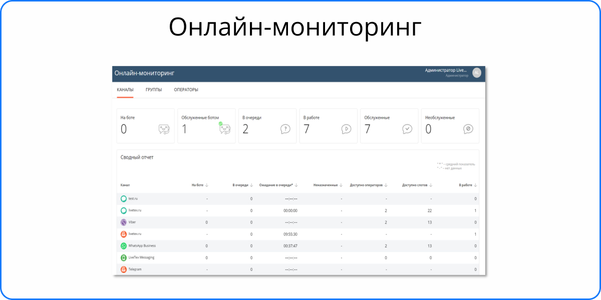 Онлайн-мониторинг для отслеживания ключевых показателей работы операторов и каналов в режиме реального времени.