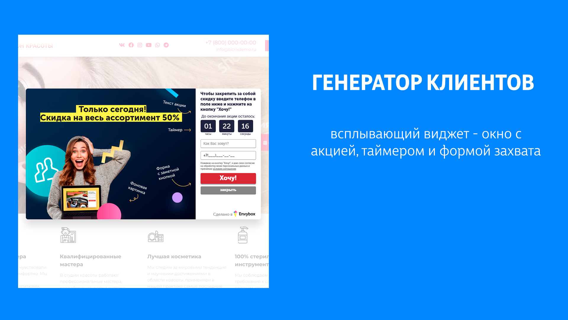 Генератор клиентов - всплывающий виджет - окно с акцией, таймером и формой захвата.