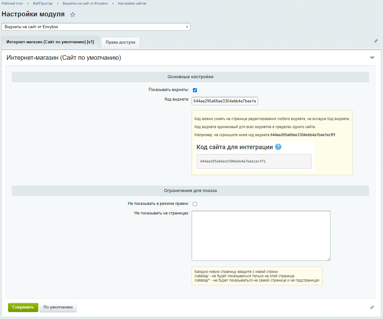 Перейти в настройки модуля или в раздел «ВебПростор/Виджеты на сайт от Envybox/Настройки сайтов»
