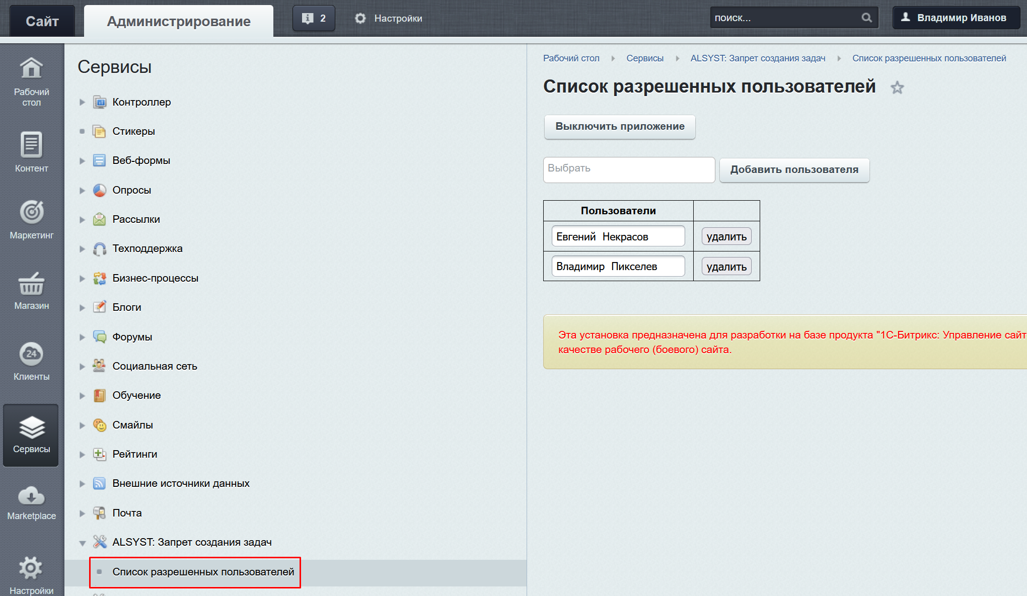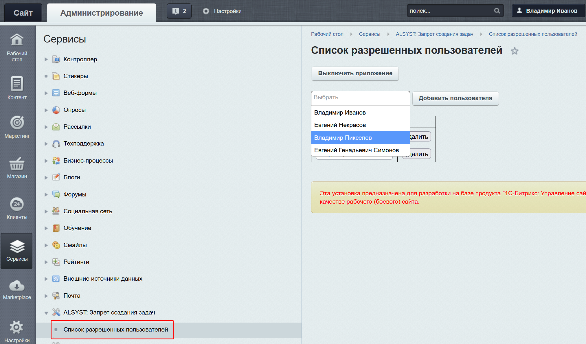 - В административном разделе сайта зайдите в пункт "Сервисы" внутри выберите пункт "ALSYST: Запрет создания задач" и нажмите "Список разрешенных пользователей"